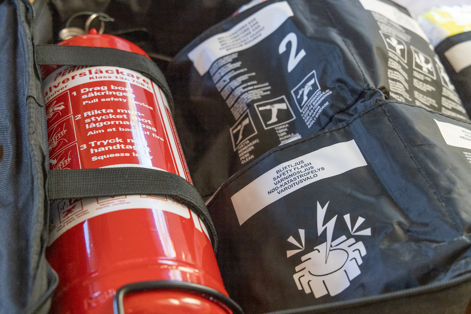 Många försäkringsbolag delar ut första hjälpen-kit som man ska ha i bilen. Brandsläckare, plåster och allt sådant som kan tänkas behövas. Utöver detta så bör du införskaffa en fönsterkross och bältesskärare. Se till så att sakerna ligger nära till hands. Som till exempel att sätta brandvarnaren i närheten av köket.