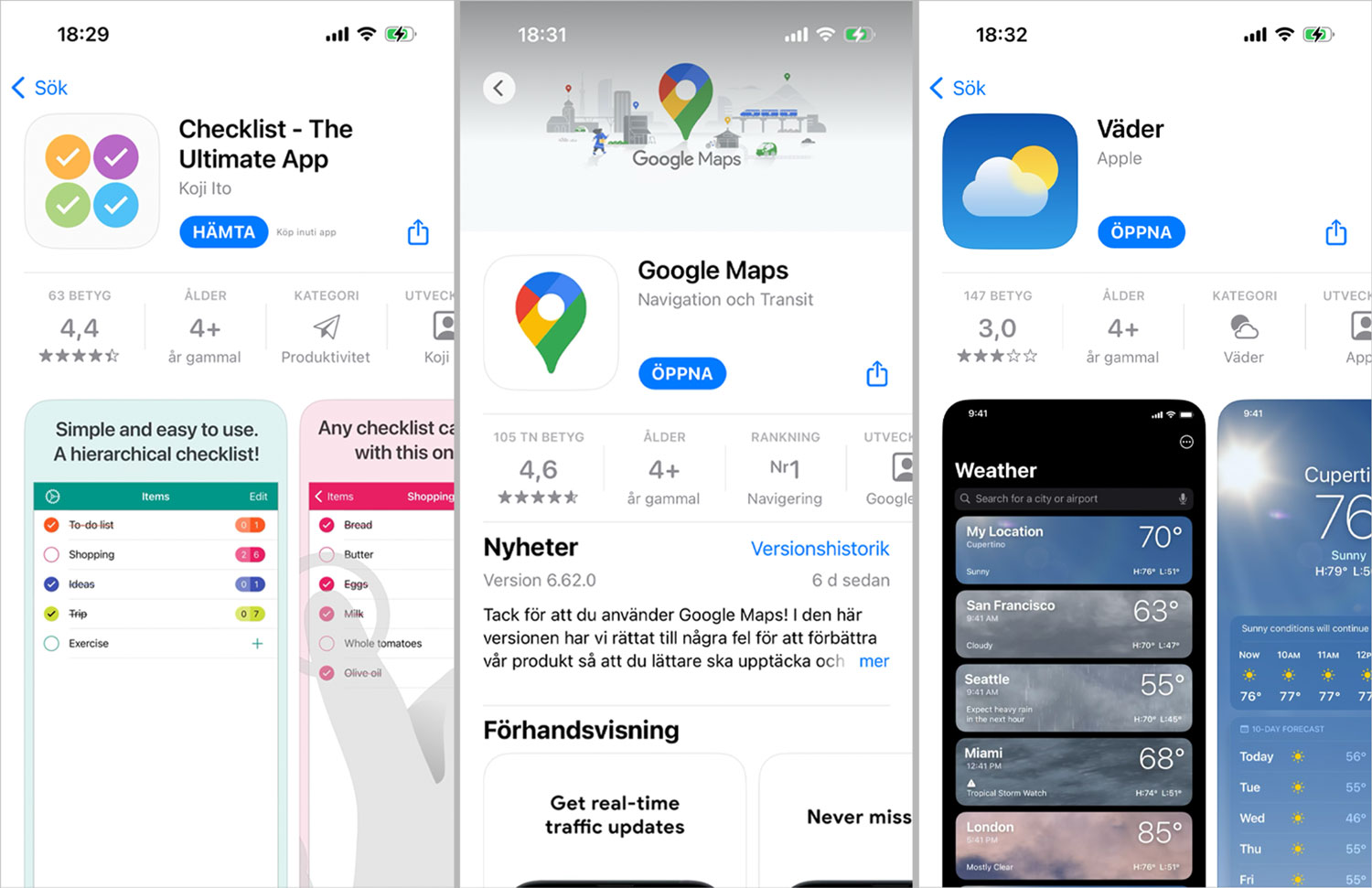 Samtliga appar finns till både iPhone och android men de kan se något annorlunda ut beroende på mobil eller platta som man använder appen på.