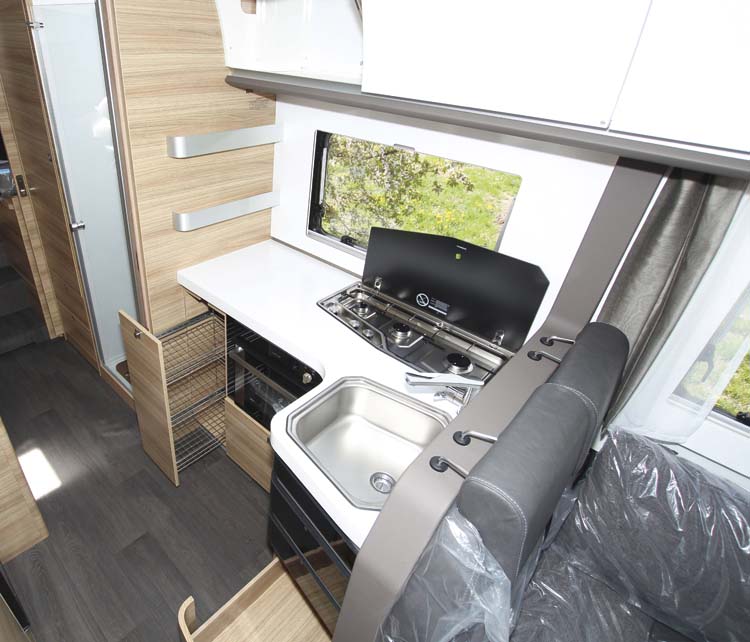 Vår testbil är verkligen helt ny. Det innebär att leveransplasten fortfarande vilar över alla säten förutom bildelens två kaptensstolar. Det blir husbilens första ägare som får bryta plasten, men givetvis så har soffans klädsel samma mönster och struktur som bilsätena. Bordsskivan är väl tilltagen och är justerbar i sidled. Runt bordet ryms sex personer utan problem och bildelens säten låter sig snällt vridas runt 180 grader utan protester.