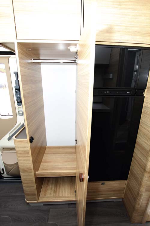 Väl inne i bodelen märks det att Adria tänkt till. Här finns flera omtänksamma detaljer. Skofack direkt till vänster. Räcker inte det, finns ytterligare ett fack precis framför dig när du stiger in i husbilen, under L-soffans kortsida. Under det sidoplacerade sätet, mitt över L-soffan, finns även där förvaringsyta. Och se, direkt runt hörnet, till vänster om ingången och bredvid det kombinerade kyl/frys-tornet finns en garderob för ytterplagg. Så här ska det se ut!
