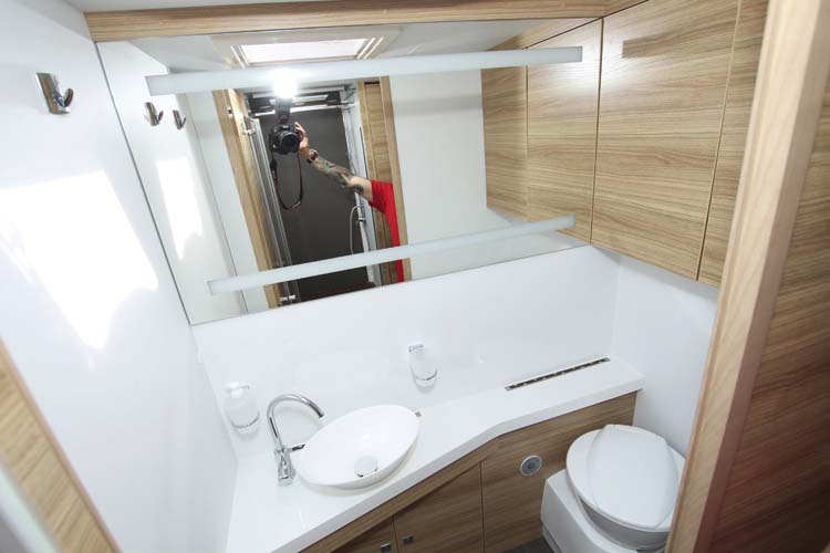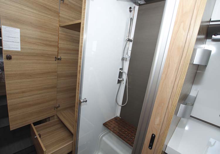 Vidare mot badrumsdelen. Från köket sett hittar du duschen till höger och toalett samt badrum till vänster. I båda fall rejält med utrymme. Duschen är utrustad med en nedfällbar sittbrits och badrummets spegel har inbyggd belysning. Och en av mina personliga käpphästar, ett 230V-uttag i badrummet för rakapparat eller hårfön, har Adria tacksamt hörsammat.