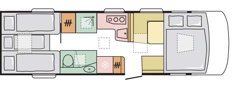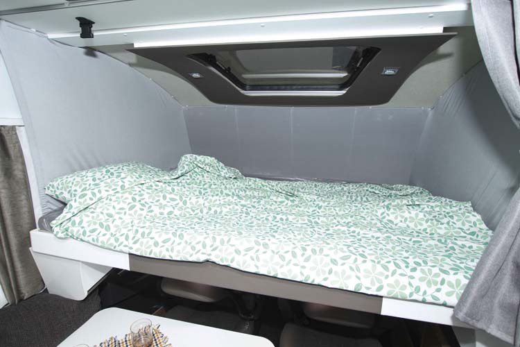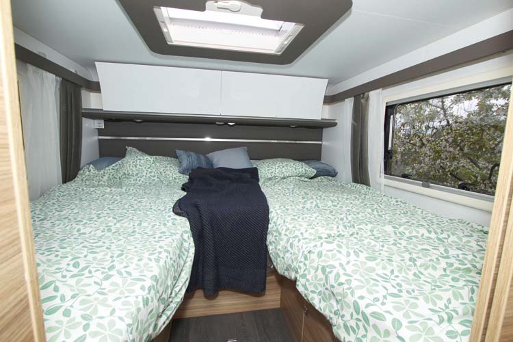Testbilen är en 810 SL, vilket innebär två långbäddar bak. Du som vill ha en queenbed bör hålla utkik efter 810 SC. Årsmodell 2020 har en ny typ av madrasser, med tyg i naturmaterial som andas. Bäddmåtten bak lyder 210x85 cm. Räkna med en relativt fast, men bekväm madrass. Överbäddens mått mäter i sin tur 190x150 cm.