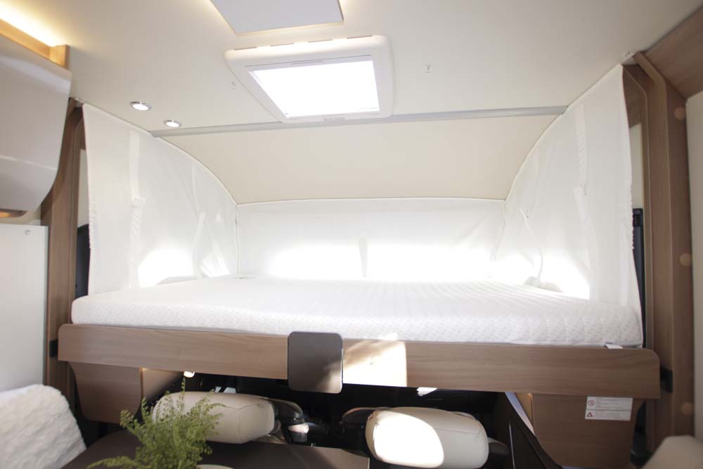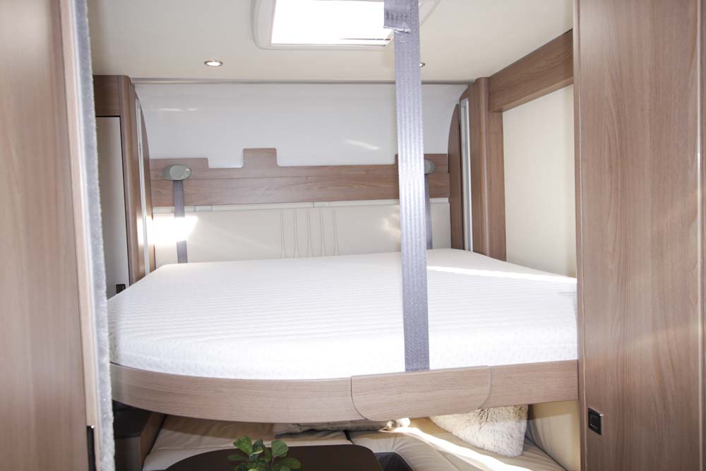 När det gäller sängplatser så är den främre överbädden i det här fallet husbilens huvudsakliga bäddlösning. Denna överbädd fälls ned manuellt och det låter sig göras utan större ansträngning. Stegen, för att komma upp, finner du i det bakre golvfacket. Den bakre franska bädden sänks dock ned på elektrisk väg. Det innebär, för dig som inte låter nyckeln sitta kvar i låset, ytterligare en nyckel att hålla koll på. Och en mycket liten sådan.