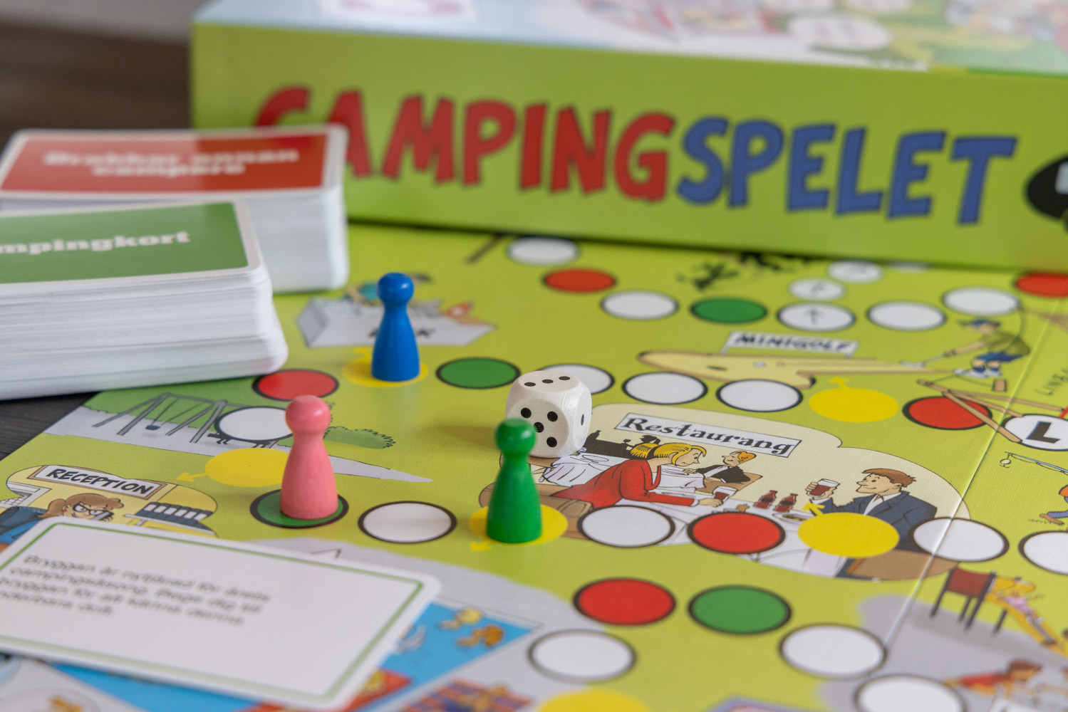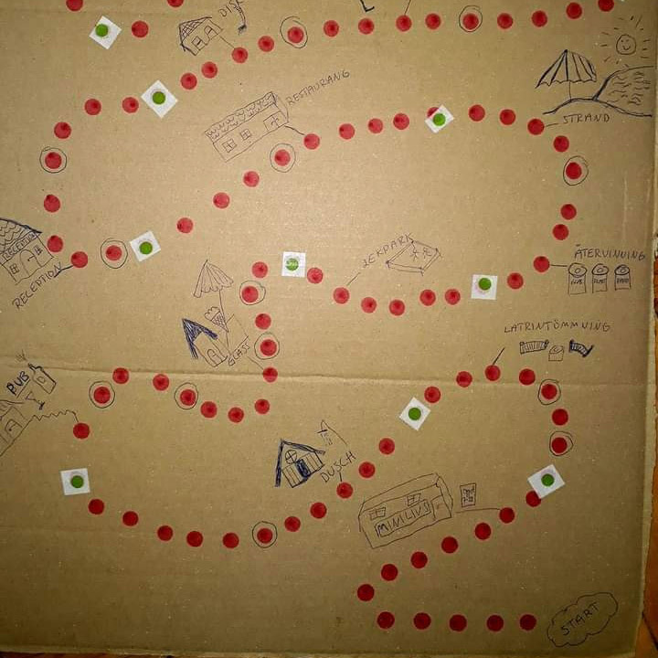 Vi har svärföräldrarna på besök och har tagit fram Campingspelet för att testa om det är roligt. Och det är det! Vi har bott i husbil i fem år så vår igenkänningsfaktor är hög. Svärföräldrarna däremot har inte samma erfarenhet men de tycker likväl att det är jätteroligt. Vi slår tärningen, flyttar fram och får ofta uppdrag med hjälp av händelsekorten. Mini är nästan i mål när han, med hjälp av svärfar får ta sig tillbaka till receptionen.