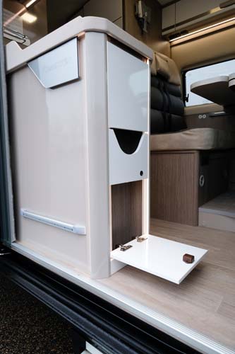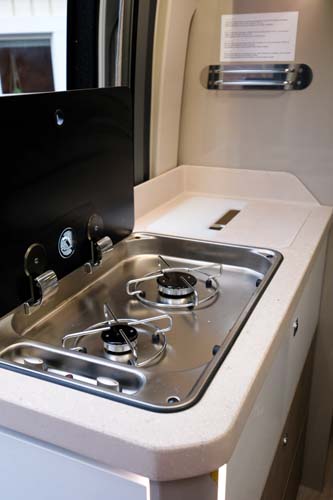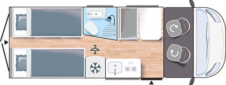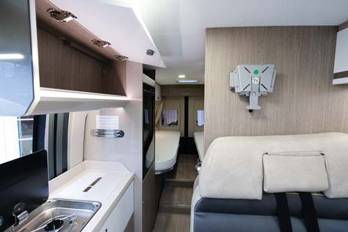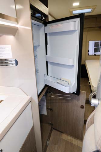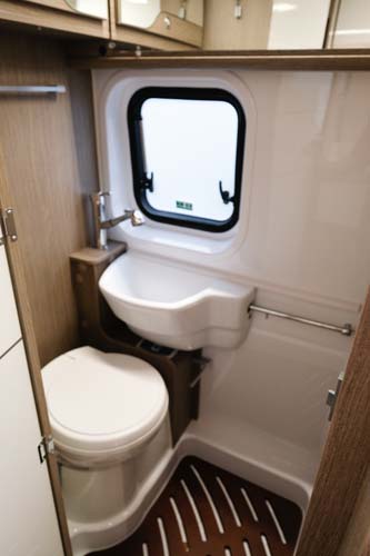 Den formgjutna köksbänken har en tvålågig spishäll, inbyggd diskho och stänkskydd. Väggskåp finns i loungens båda långsidor som tillsammans med tre djupa utdragsluckor under köks- enheten innebär stuvutrymme för matvaror och husgeråd. Köket eller loungen ger ett gott och välkomnande intryck. Ett klädförråd med utdragbar klädhängare finner vi till vänster direkt efter köksenheten. Ovanpå klädförrådet har man placerat kylskåpet (80 l med isfack) och mittemot finns badrummet med kombinerad dusch och öppningsbart fönster. Duschslangen kan således också dras ut genom badrumsfönstret. En fiffig grej är att handfatet i badrummet kan skjutas i sidled, vilket innebär lite mer plats vid behov.