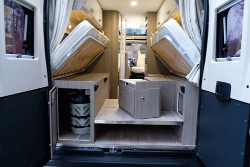 Det som imponerar allra mest med Chausson V 697 är annars bakdelen, det vill säga sovrummet och garaget. Här finns två långbäddar med bekväma sovmadrasser på vardera sida, med gångutrymme mellan sängarna och med en hel del förvaring under sängen på vänster långsida i förarens riktning. Under sängen på den högra långsidan finns löstagbara skåpmoduler, s.k. Flexbox – ett smart förvaringskoncept, som innebär att man kan modulera om och flytta ut eller in de olika enheterna – beroende på vilken funktion man vill att bilen ska användas till, semestern eller vardagen. Utöver detta finner vi ett dubbelgolv med lämplig förvaring av till exempel campingstolar, bord och annat. Sängarna är vikbara och går att fällas upp för till exempel flytt- och cykel- transporter m.m. De båda enkelsängarna går även att bygga ihop till dubbel- säng med hjälp av medföljande madrasser, som också kan användas för bäddbar dinette fram. Praktiskt! I sovrummet finns vägghängda överskåp med plats för böcker, telefon o dyl. Dessutom finner vi flera USB-uttag och eluttag, så visst kan man vara laddad för äventyret. Lastvikten är 505 kg, vilket får anses vara en bra tilltagen lastvikt och lämplig för 2 personer.
