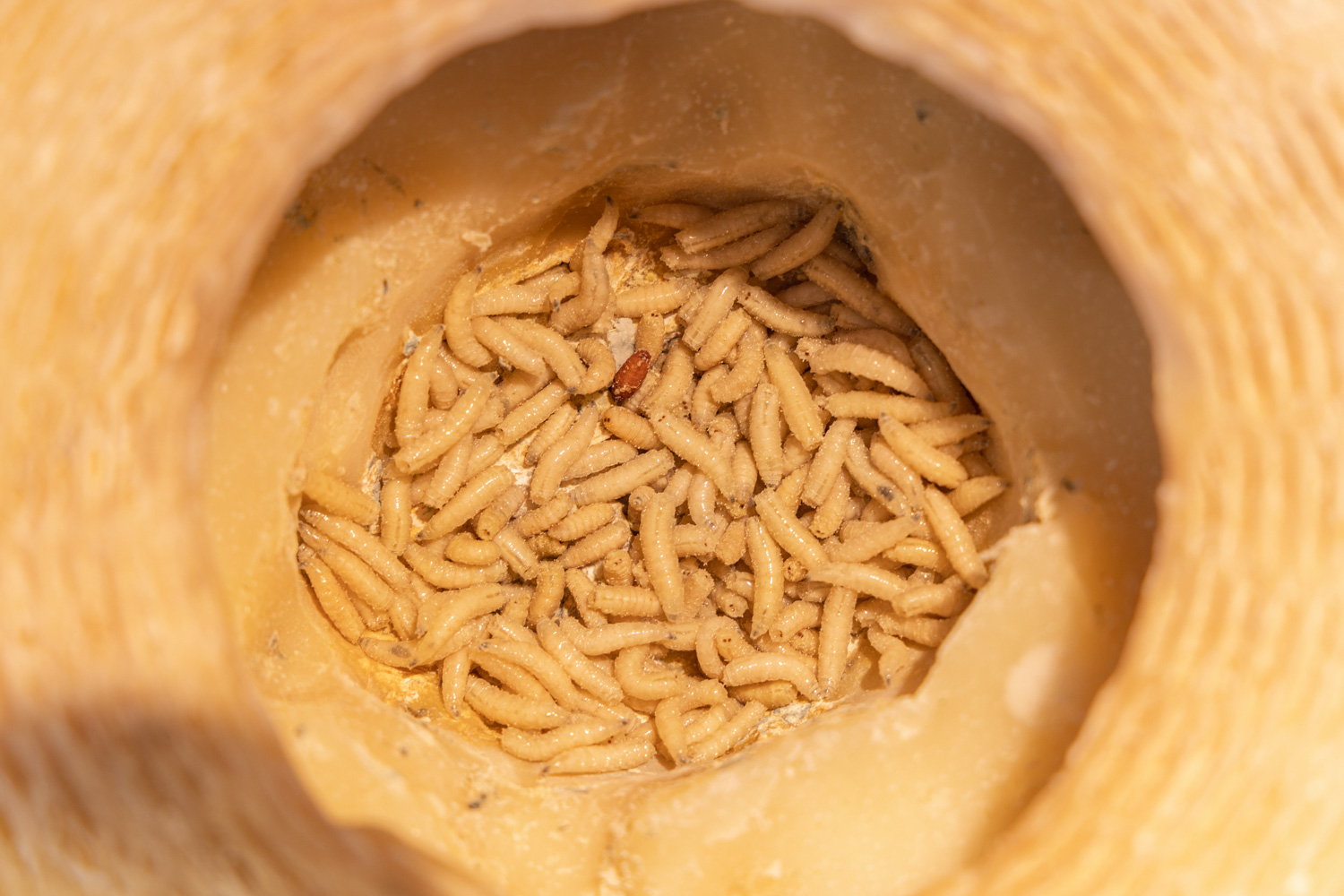 Alla ostälskare se hit för detta är en riktig delikatess från Sardinien. En pecorino-ost öppnas och lämnas ute för att locka till sig ostflugor. Dessa lägger sina ägg i osten och larverna börjar sedan att äta sig ur osten. Deras bajs kan jämföras till konsistensen av en mjukost och ska vara en delikatess. Alla som äter osten måste skydda ögonen från hoppande larver. En annan anledning till att denna ost nu är olaglig inom hela EU är att larverna kan överleva inuti en människa och kan äta sig igenom tarmväggarna.