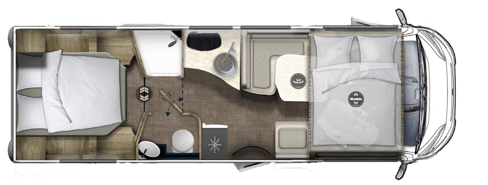Låt oss flytta oss bakåt, till bodelen. Den värms upp tack vare Aldes vattenburna värmessystem, vilket även gäller golvet. Testbilen har ett särskilt Skandinavienpaket vilket, om vi ska fortsätta att fokusera på värme, också innebär värmeisolerade dubbelglas till sidorutor, solvärmesystem, värmeväxlare samt varmvattenvärmare.