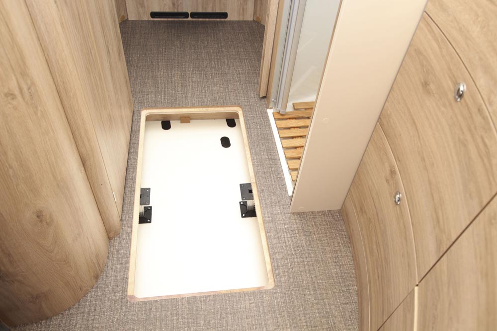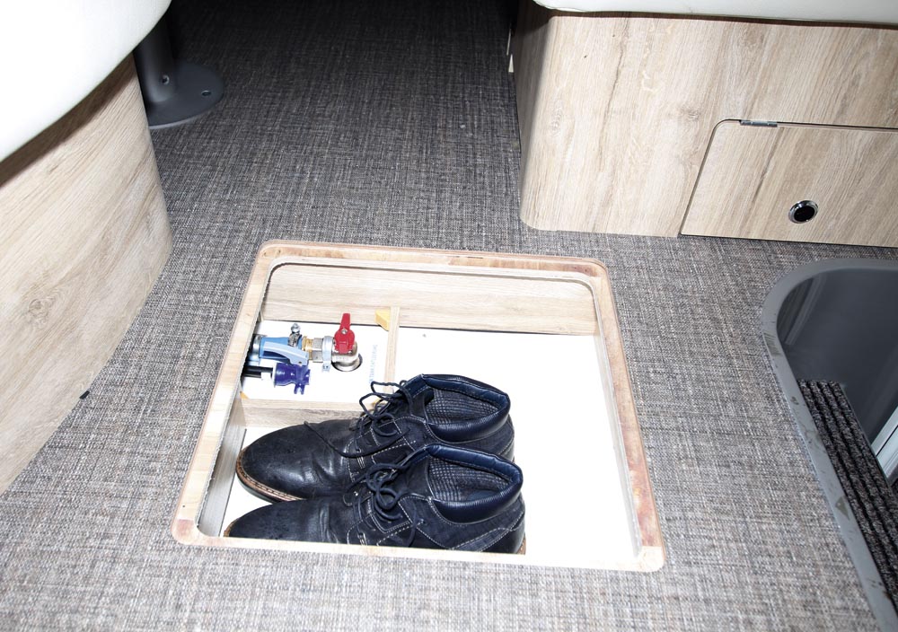 Bodelsdörrens entré har ett lågt insteg som känns helt acceptabelt som det är. Husbilen saknar utfällbart trappsteg. Vid entrén finns ett golvfack med 11 cm djup och plats för åtminstone två-tre par lågskor. Kängor och allt över det blir dock värre att gömma här. Kanske kan utrymmet under L-soffans vinkeldel användas. Fast det är rätt bökigt att komma åt där varje gång skor ska hämtas/lämnas där förstås. Bättre att förvara andra saker som mer sällan behövs där. L-soffans tvåsitsdel, riktad i färdriktning gömmer vätsketank men kompenserar bristen på förvaringsmöjligheter med bältesplats och Isofix-fästen.