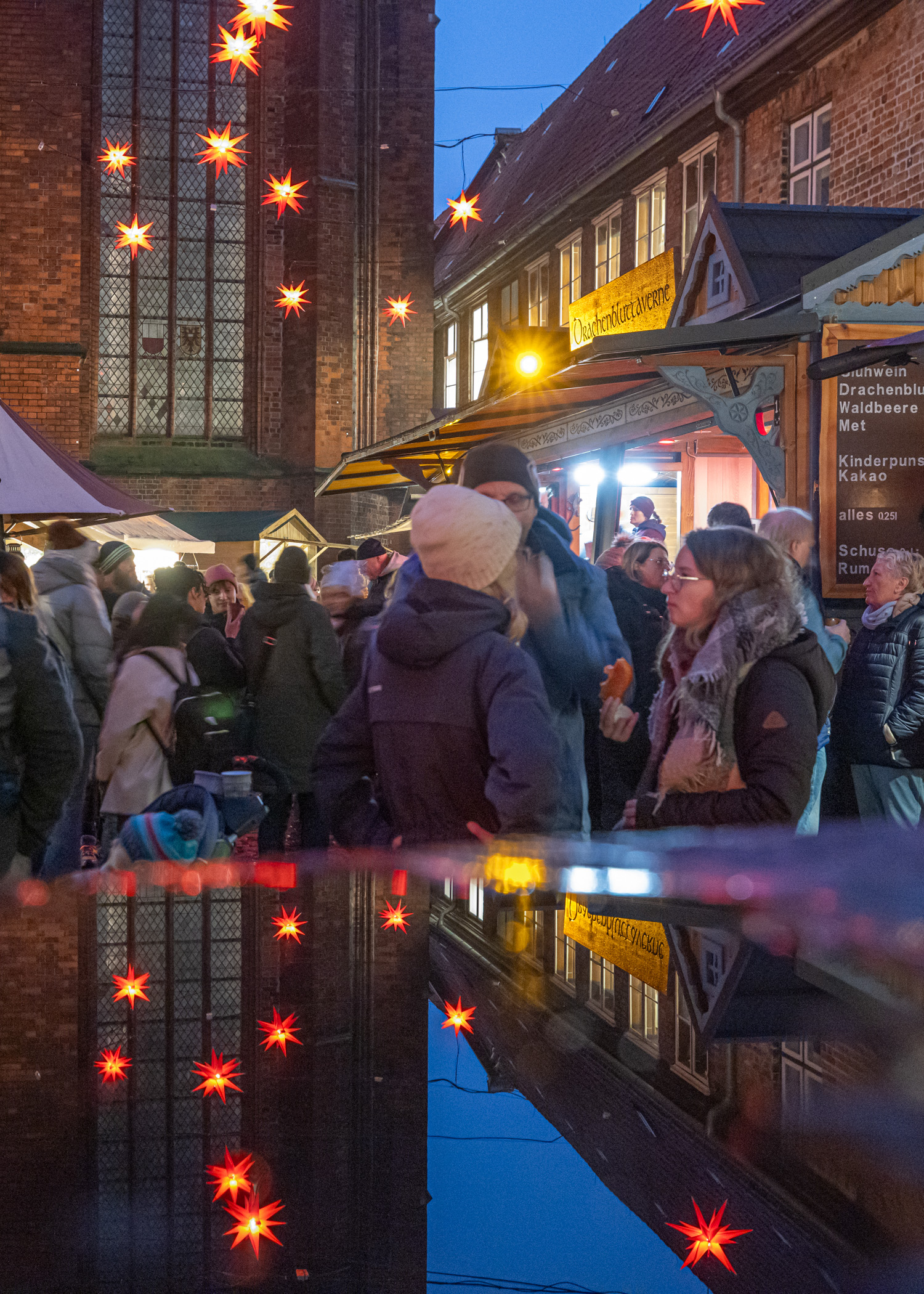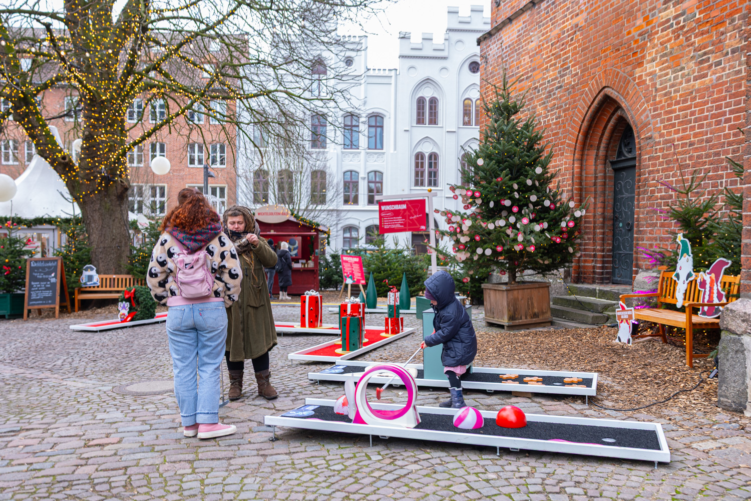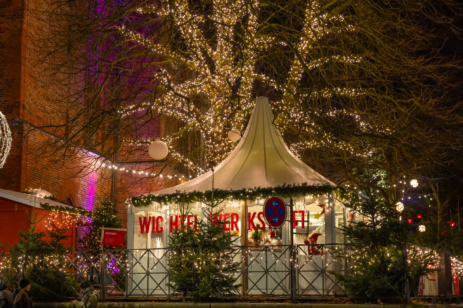 Inte så stor julmarknad i centrala Lübeck men ändå fullt komplett. Här förvandlas fokus delvis till alla upplysta julgranar som transporterats hit och fått en mängd ljusslingor i sig. Lite likt en labyrint tar du dig fram bland granarna. Några marknadsstånd säljer hantverk men det som lockar mest är absolut mat- och dryckesstället som finns i mitten av labyrinten. Bänkar bland granarna skapar en väldigt mysig stämning och ur en liten hydda leveras mat och dryck i ett rasande tempo. Det blir snabbt fullt på sittplatserna så det gäller att vara snabb och greppa en plats när det dyker upp. Turligt nog finns det mycket att njuta av runtomkring området så ett alternativ är att gå förbi lite med jämna mellanrum och slå sig ner när någon lämnar.