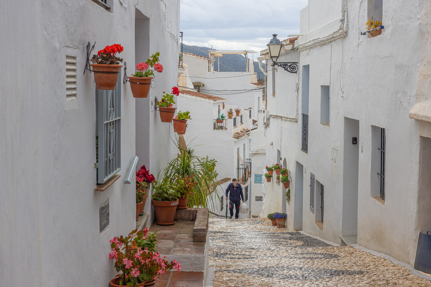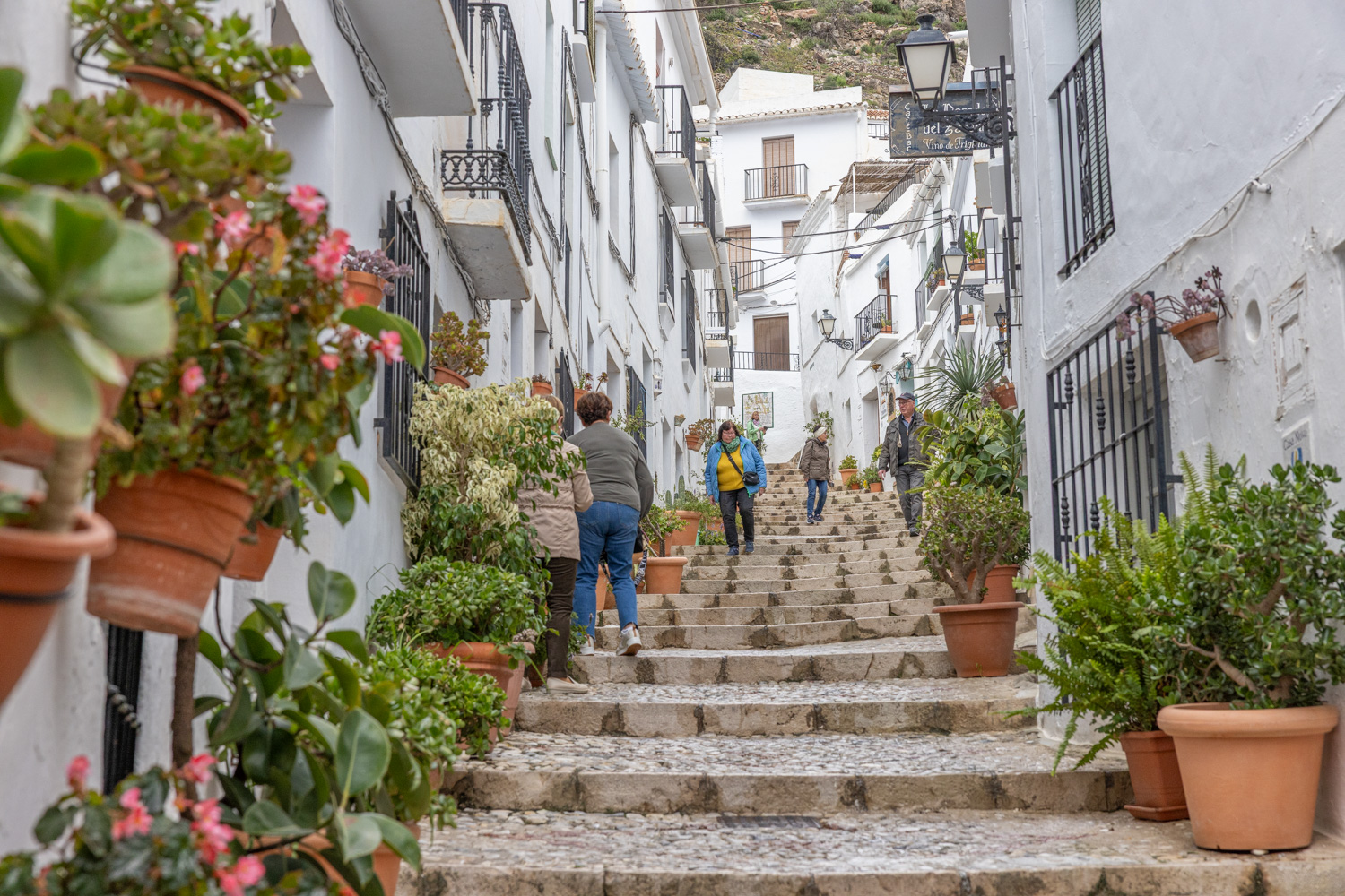 Idag har det blivit en tradition och en del av stadens kultur att alla hus ska vara vita. Den enda byggnaden som inte är helt vit är stadens sockerfabrik. Den har en gul-brun färg som tidigare varit vit. Vad som hänt är att det kom en stor sandstorm (Calima) för några år sedan. När stormen lagt sig satte alla igång att måla husen vita igen. Tydligen ville naturen någonting annat för innan husen hunnit torka blev de täckta av sand igen. Sockerfabriken är gammal och har en kulturmärkning så den får inte hanteras hur som helst, därav den sandfärgade fasaden. Till Frigiliana kommer du för att ta en trevlig promenad i byn och kanske njuta av någonting gott att äta eller dricka. Byn är liten så det tar inte så lång tid att ta sig runt men ta det i godan ro så kommer du snart att upptäcka alla detaljer som finns överallt.