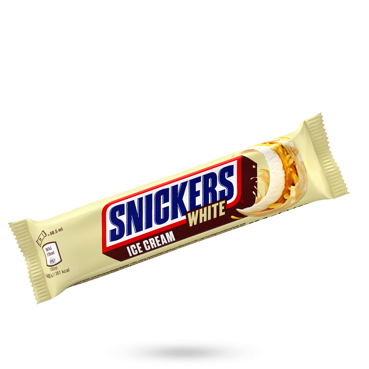 Gräddglass fylld med jordnötter, karamell, en krämig kärna och överdrag av vit choklad. Trevligt med en nyhet till den klassiska Snickers glassen. En överraskande nyhet som står sig bra en varm sommardag.