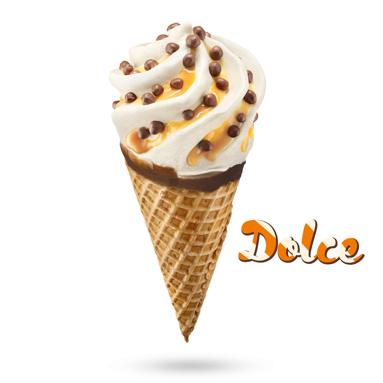Våfflelstrut med glasyr av chokladsmak, vaniljglass med kolasås toppad med knäckbitar. En riktigt smakrik glass som faktiskt har förmågan att mätta också även om den i sig inte är mäktig.