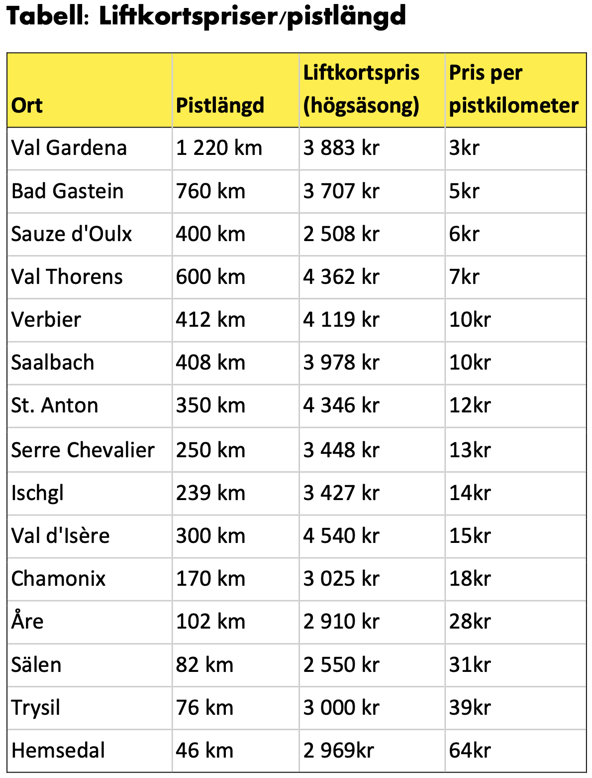 Ifall du väljer att åka skidor i Val Gardena så kostar en pistkilometer ynka tre kronor jämfört med om du väljer en backe i Hemsedal då det istället sticker iväg till hela 64 kronor per pistkilometer.