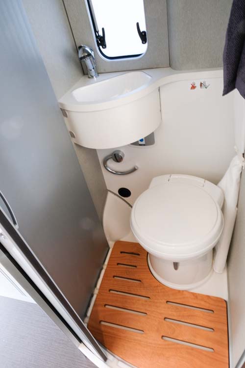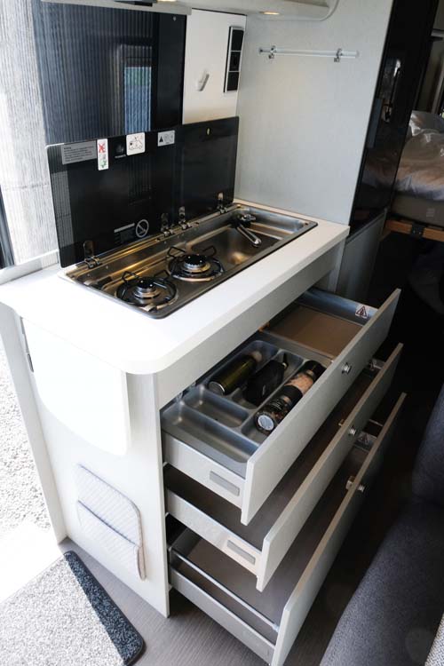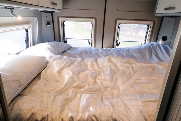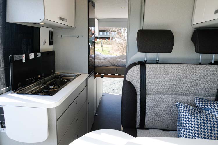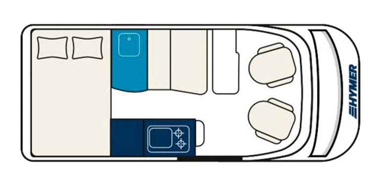 Inredningen är ljus och välkomnande. Hymer har lagt sitt krut på förvaring. I köksenheten finns tre rejäla utdragbara lådor som tillsammans med väggskåpen sväljer en hel del matvaror och diverse köksgeråd. Köksbänken har en 2-lågig spishäll och vask. Dessutom är bilen utrustad med ett 90 l kylskåp i ståhöjd. Samtliga skåpluckor har softclose. Klädseln i textil heter Kitami och med möbeldekoren Free Campus blir helhetsintrycket fint tillsammans med de fina snickerierna. Hymeringenjörerna har även lyckats få till ett hyggligt stort hygienutrymme med duschgolv. Bra jobbat! I sovrummet med tvärställd dubbelbädd finns ytterligare förvaring i väggskåp runt om. Även här har Hymercar lyckats bra – trots det begränsade utrymmet.