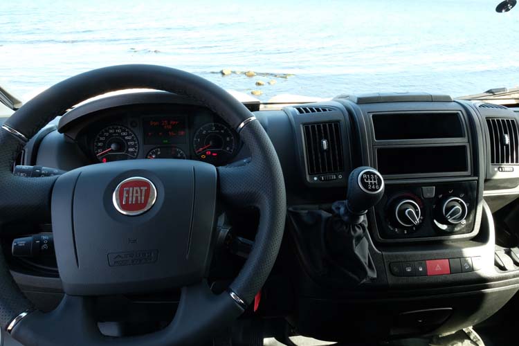 I förarkupén är allt välbekant. FIAT-emblem på ratten, bekväm sitt- och åkkomfort och med en väl beprövad instrumentpanel är förarmiljön både begriplig och lättöverskådlig. Här finns förstås alla möjliga och tänkbara säkerhetssystem, såsom ABS, ASR och ESP inkl. Traction +. Även elektriskt juster- och uppvärmningsbara sidospeglar, varselljus, Hill Holder Decent Control vilket också underlättar en säker och bekväm körning. Med filbytesvarning (LDWS), vägmärkesassistans (TSR) och kollisionsvarningssystem med nödbromsfunktion är vi säkerhetsutrustade till tänderna. Så på med säkerhetsbältet - nu drar vi iväg med ”friheten” och motor under huven på 140 hästar och manuell växellåda.