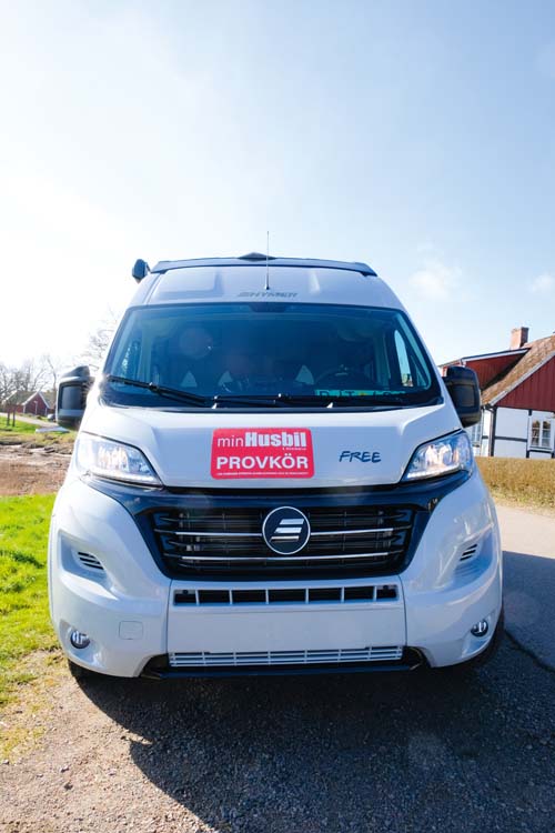 På Hymer Center i Ängelholm har säljaren Daniel rullat fram Hymercars plåtis Free 600 till oss för provkörning. Eftersom den ska plåtas är den nytvättad och fin. Innan vi drar iväg springer Daniel ut i ett huj och sprayar lite extra glans på däcken – vilket får den att skina ännu mer denna soliga vårdag.