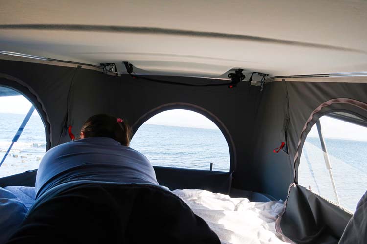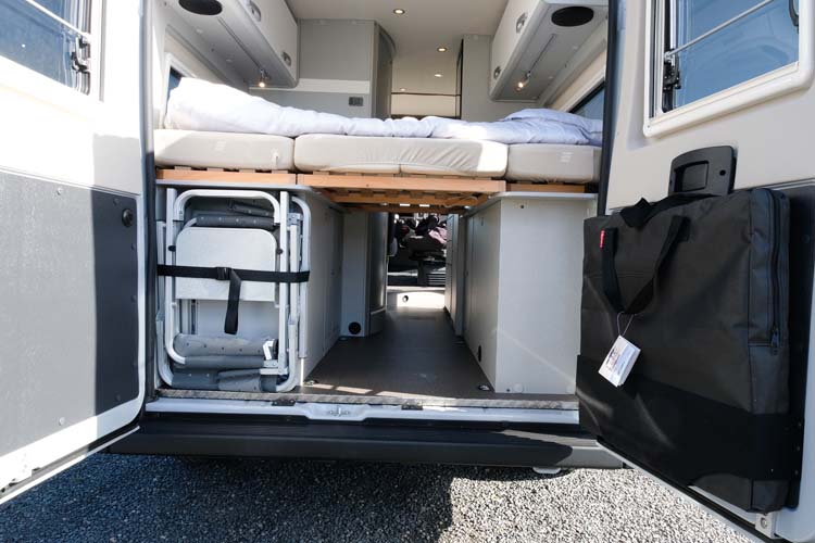 Det som jag trots allt gillar bäst med den här bilen är det uppfällbara taket. För den som är lite ovan kan det nog vara lite knepigt att fälla upp och ner taket, man behöver nog öva på själva handhavandet och tekniken några gånger. Med taket uppfällt kan ytterligare 2 personer sova här uppe riktigt bekvämt. Oavsett, så är det riktigt mysigt att sova uppe på loftet där man har fin utsikt åt tre håll. Att ta sig upp och ner är busenkelt tack vare en hopfällbar teleskopstege som förvaras i utrymmet ovanför förarkupén. Stegen borde enligt mig hitta annan plats eftersom utrymmet över förarhytten känns passé. I garaget finns det plats för ännu mer prylar, både i väggskåpen och under den vikbara sängdelen – som uppfälld ger plats åt skrymmande saker som cyklar och annat. Väljer man extrautrustning kan man köpa 2 hopfällbara campingstolar samt bord, inkl. hållare att fästa på gasolluckans innerdörr respektive insidan på ena bakdörren.