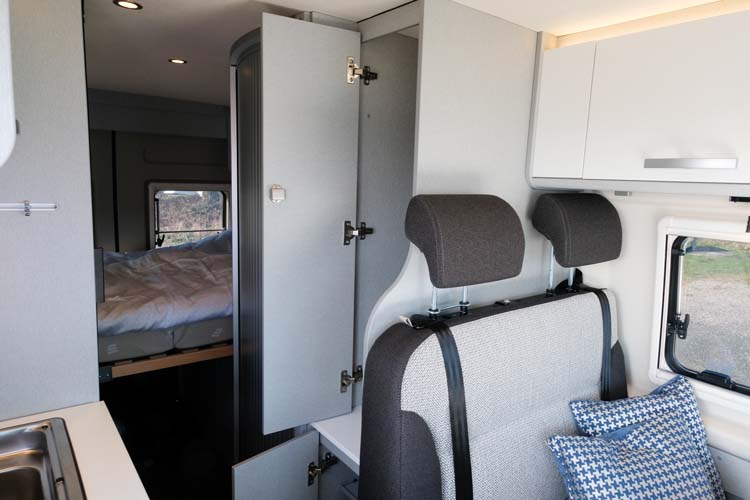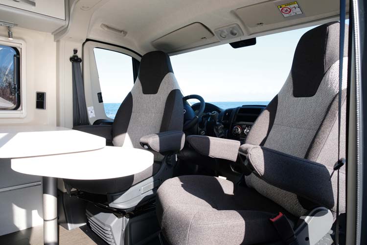 Många anser att alla plåtisar i princip ser likadana ut. Men även mindre förändringar kan ge att annorlunda intryck. Det gäller allt från tillverkarens formspråk, fönster, design, stripning och färg. När det gäller planlösningarna är även dessa i stort sett identiska – men här kommer ingenjörernas kreativitet oftare mer till sin rätt. I vår testbil har man rak tvåsitssoffa, svängbara framstolar och soffbord med liten tilläggsskiva. Svängrummet mellan stolarna till bordet är dock i kortaste laget, vilket kan vara smått irriterande. Av utrymmesskäl har man medvetet krympt detta utrymme för att få plats med en tvådelad garderob bakom soffan, vilket är bra tänkt. Men resultatet är inte helt lyckat!