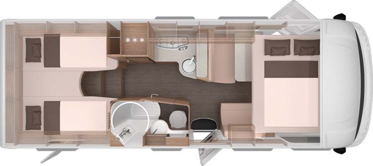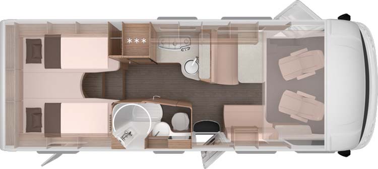 Planlösning: Dinett med L-soffa och 2-sitssoffa. Långbäddar bak, manuellt nedfällbar taksäng,