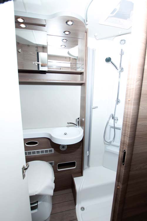 Det är de små – men många – detaljerna som hjälper till att lyfta produkten. Möblerna i såväl sovrum, kök som dinett känns mer omsorgsfullt designade med mjuka designlinjer och högre finish. Det både känns som och är ett faktum att tillverkaren lagt ned mycket mer energi på design och materialval. Något du lär notera direkt redan vid anblicken av kökets mjuka designlinje och skåpluckornas påkostade finish. Dessutom är valmöjligheten större i Knaus-programmet. Knaus L!VE I-serien erbjuder sex olika textilklädslar. Klädseln i vår testbil heter Active Rock. Knaus L!VE I 700 är som standard utrustad med märkets eget så kallade 3D-badrum. En fast badrumslösning med en fast duschkabin vars skiljevägg består av en cylinderformat jalusi som roteras för att stänga/öppna duschkabinen. Den som vill ha extra mycket plats i badrummet kan dock välja det så kallade komfortbadrummet. Ett badrum med traditionell svängbar vägg som förvandlar ytan till antingen ett badrum eller en extra rymlig duschkabin.