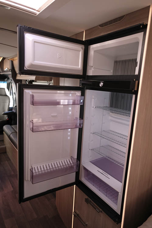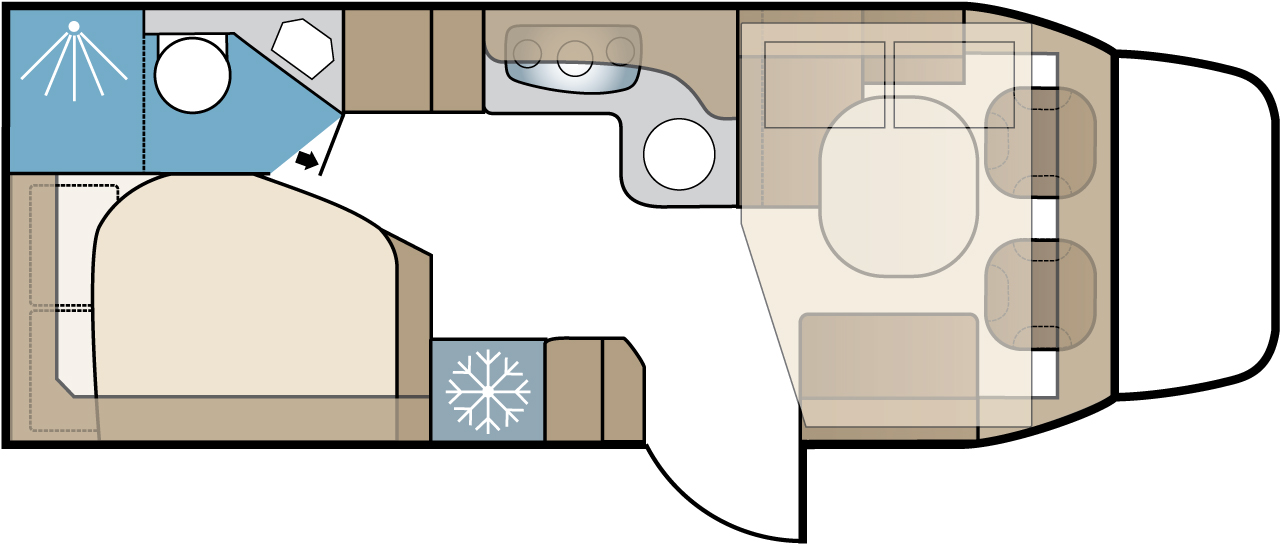 Köket är välutrustat med 3-lågig spishäll, diskho och ugn. Samtliga lådor i köksenheten är mjukstängande och tillsammans med överskåpen är det gott om förvaring av husgeråd, torrvaror m.m. En stor kyl med frysfack, från Dometic, öppningsbart från båda hållen, är standard. Stor garderob, skofack och värmeskåp är annat som sticker ut i den här modellen.