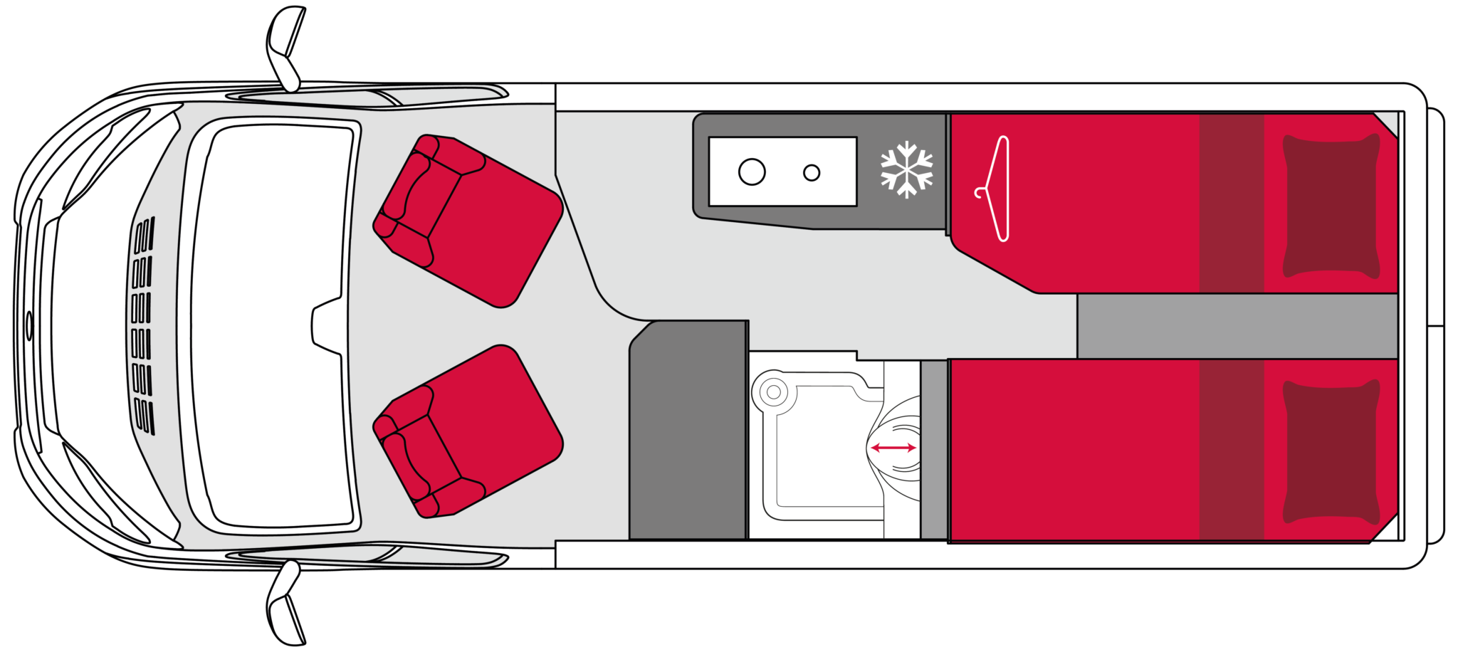 Planlösning: Två svängbara framstolar, långbäddar bak.