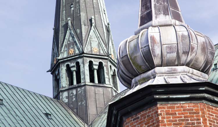 Vid foten av Maria-tårnet med sina kyrkklockor ståtar en staty av Hans Tausen, munk, lutheran, Danmarks förste reformator och biskop i Ribe i mitten av 1500-talet.