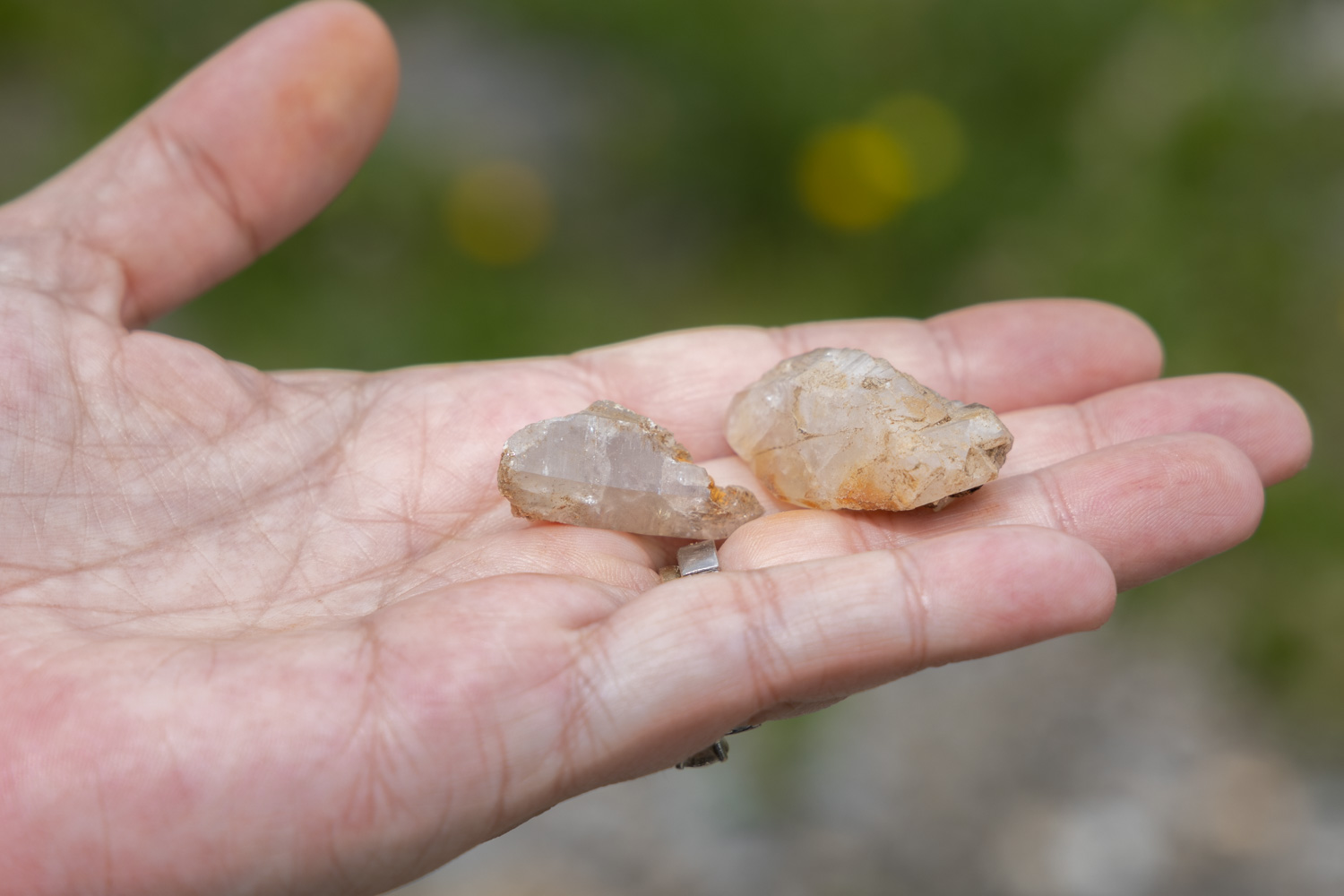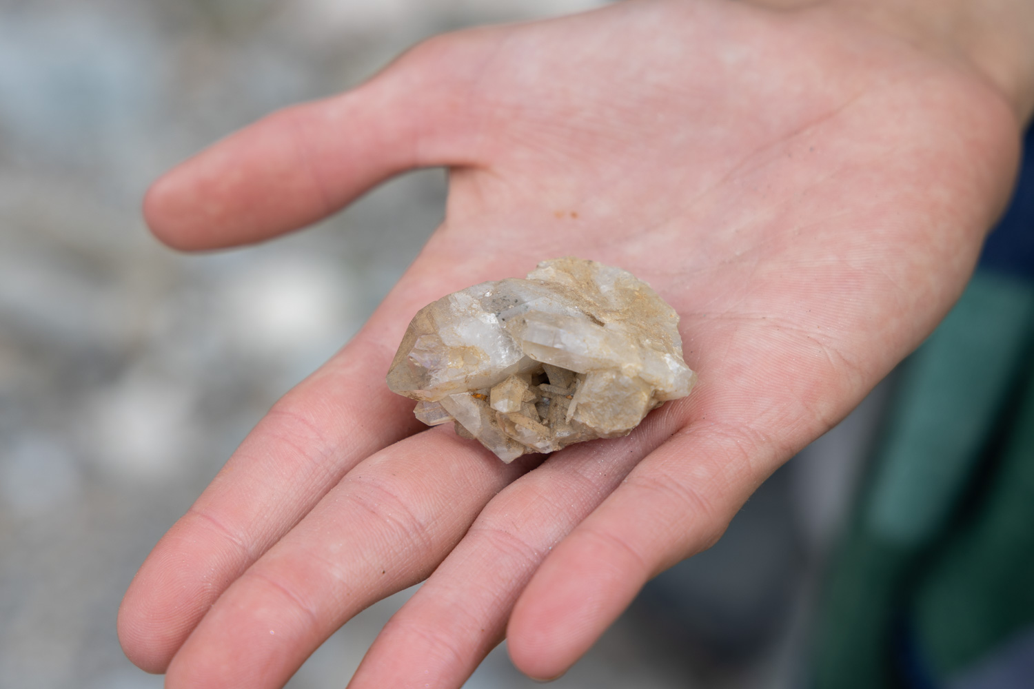 Plötsligt står Mini med en kristall i handen. Den är äkta visar det sig. Glädjen är stor och den blir ännu större när vi får reda på att fyndet får följa med hem. Tydligen så är det okej att ta saker härifrån. Guiden förklarar att det årligen kommer nya skatter med snön och vattnet så även ifall besökarna är många så ska det finnas kristaller till alla. Och efter en sisådär 45 minuter har nästan alla i gruppen hittat en kristall som de vill ha med sig hem. Vissa är finare än andra och vi märker snabbt att vår kristall inte tillhör toppskicket. Nåja, det kanske inte blir ett smycke av den men den får ändå följa med hem.