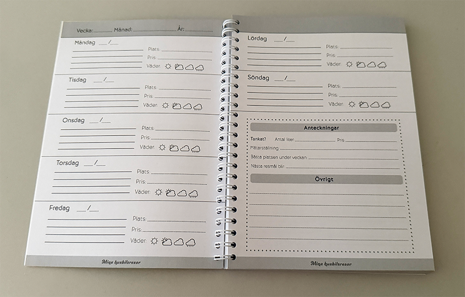 Varje uppslag i loggboken omfattar en vecka med plats för korta anteckningar dag för dag samt en halvsida för speciella anteckningar och övrigt. Fyll själv i vecka, månad och år. Loggboken blir med andra ord inte gammal efter ett kalenderår, för dig som kanske är ute med husbilen en månad om året. Boken har också en smidig ficka för kvitton och minnen.
