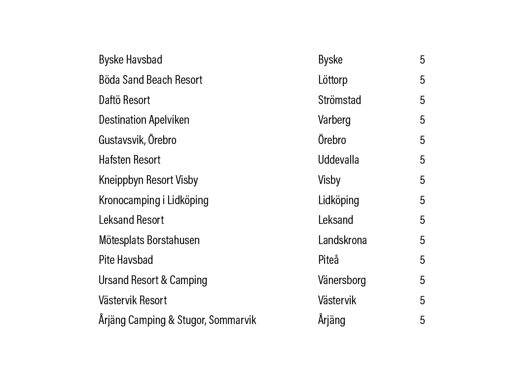 Riksorganisationen Svensk Camping rankar varje år campingar och inför sommarsäsongen 2025 har 14 svenska campingplatser fått den högsta rankingen, fem stjärnor, och 59 stycken fick fyra stjärnor. Även utmärkelsen Campers' Choice 2025 har delats ut under våren, i sju olika kategorier. Vi redovisar vinnarna i respektive kategori.