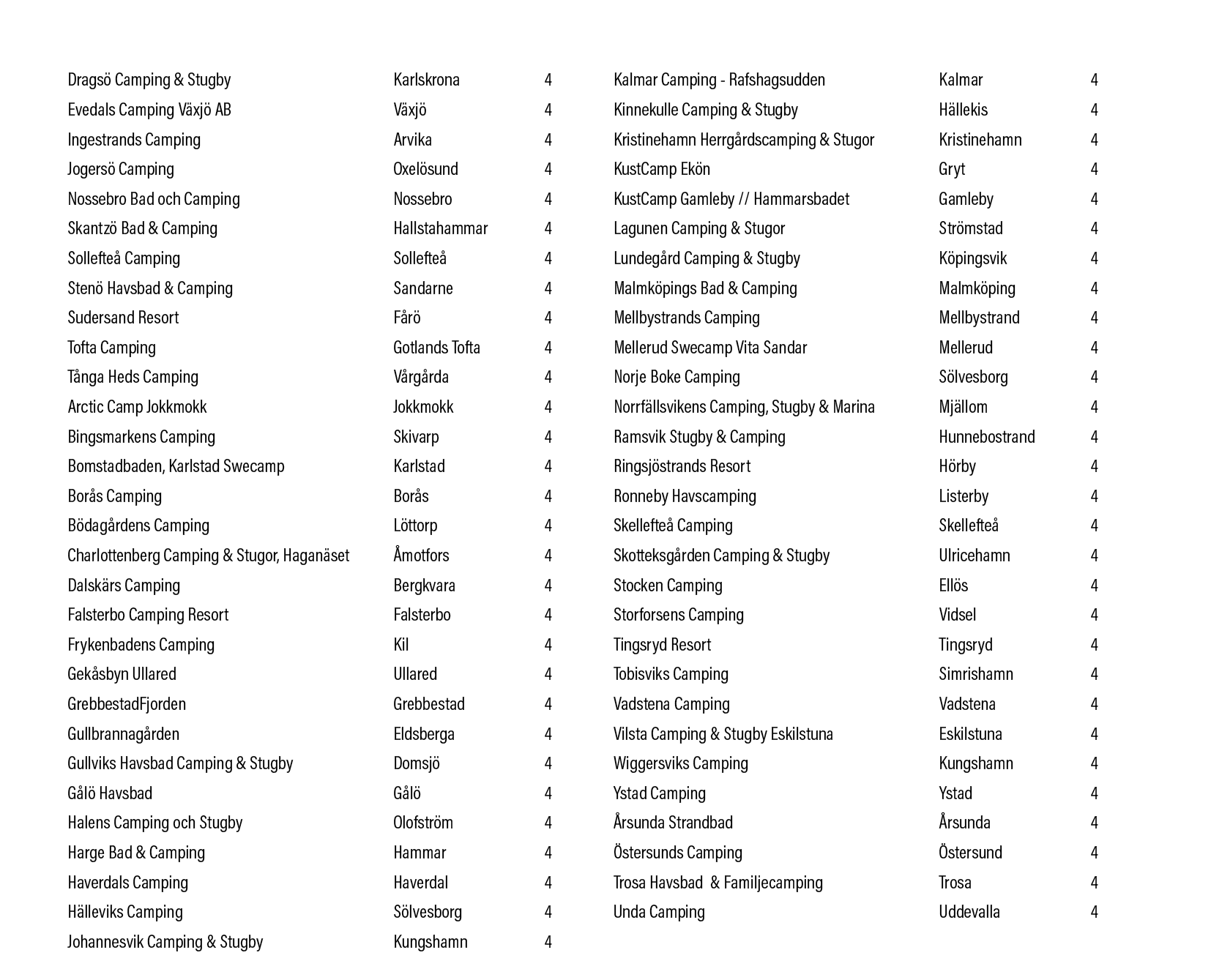 I slutet av maj släppte riksorganisationen Svensk Camping klassificeringen för anslutna campingar. Klassificeringen syftar till att göra det lättare för gäster att välja boende genom att ge tydlig information om utbud och standard. 2025 fick 14 anläggningar det högsta betyget, fem stjärnor och 59 anläggningar nådde upp till fyra stjärnor.