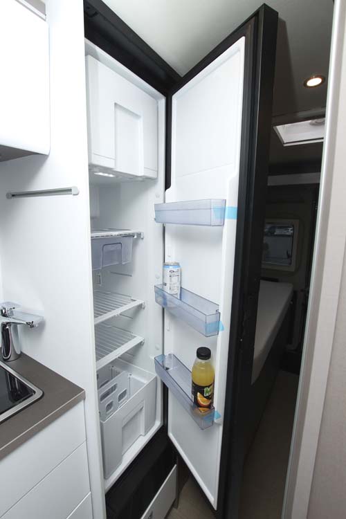 Stort kylskåp i övrigt traditionellt husbilskök och rymligt badrum med platsbesparing