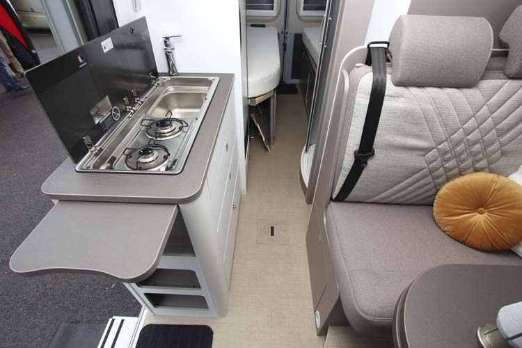 Plåtisar brukar av naturliga skäl ha begränsat med förvaringsutrymmen. Det blir extra tydligt i Eliseo, i synnerhet eftersom överhylla ovan bildelen saknas. Bilar utan popuptak är dock riktade mot tvåpersonshushåll och för dessa bör förvaringsytorna räcka, förutsatt att ni reser med någorlunda lätt packning.