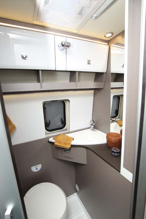 Även badrummet, där badrum och duschkabin utgör samma yta, känns typisk i sin uppbyggnad för husbilstypen sett. Men här finns mer rymd och hela modulen är omgiven av ett ordentligt jalusi som tillåter dig att skärma av ytan helt, samtidigt som jalusilösningen också är väldigt utrymmesbesparande.